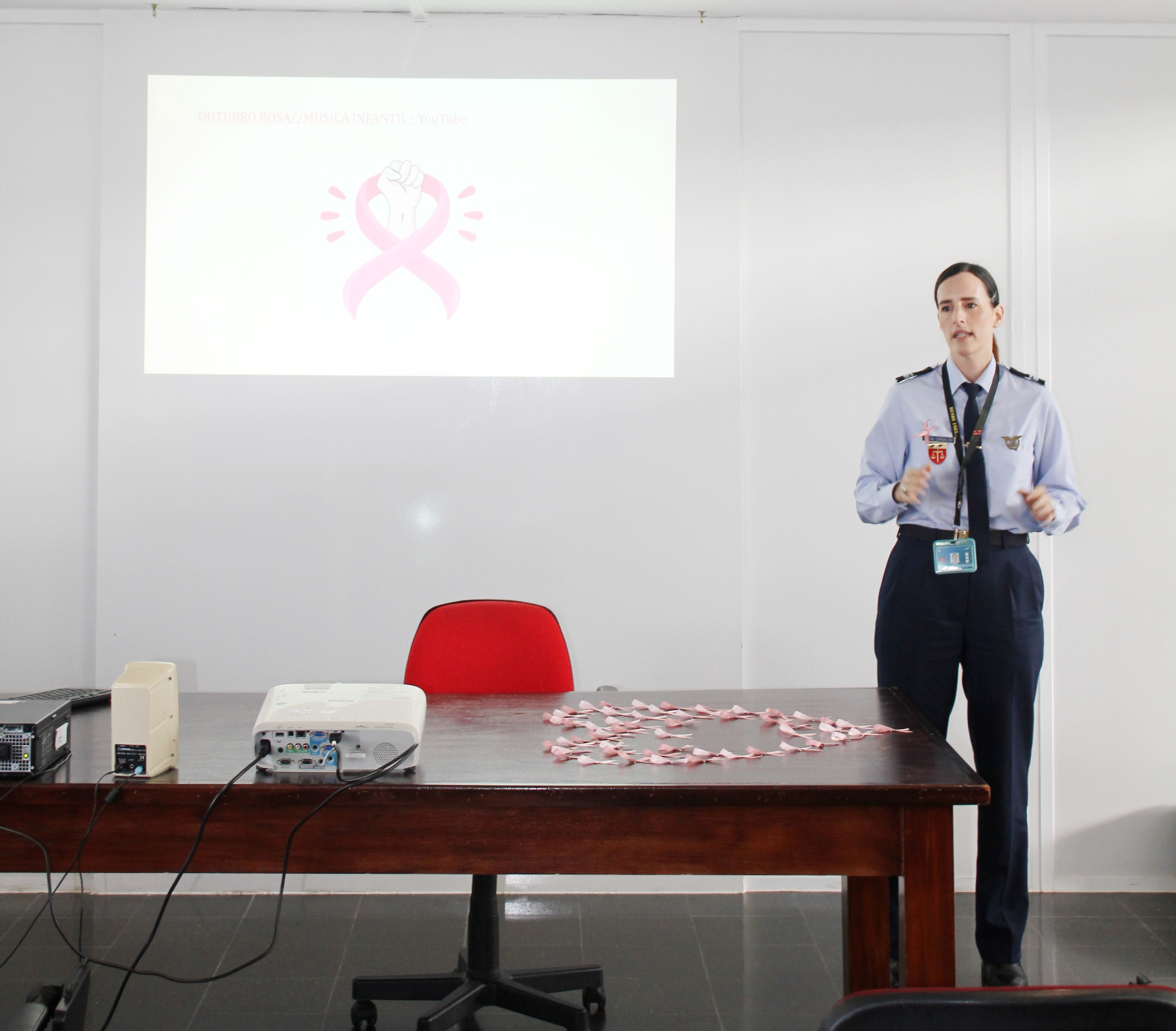 No final da palestra, todos os participantes receberam um laço rosa, símbolo da consciencialização e da luta contra o cancro da mama, que envergaram ao peito. Posteriormente, realizaram uma caminhada junto aos passadiços que se encontram junto à unidade da Força Aérea.