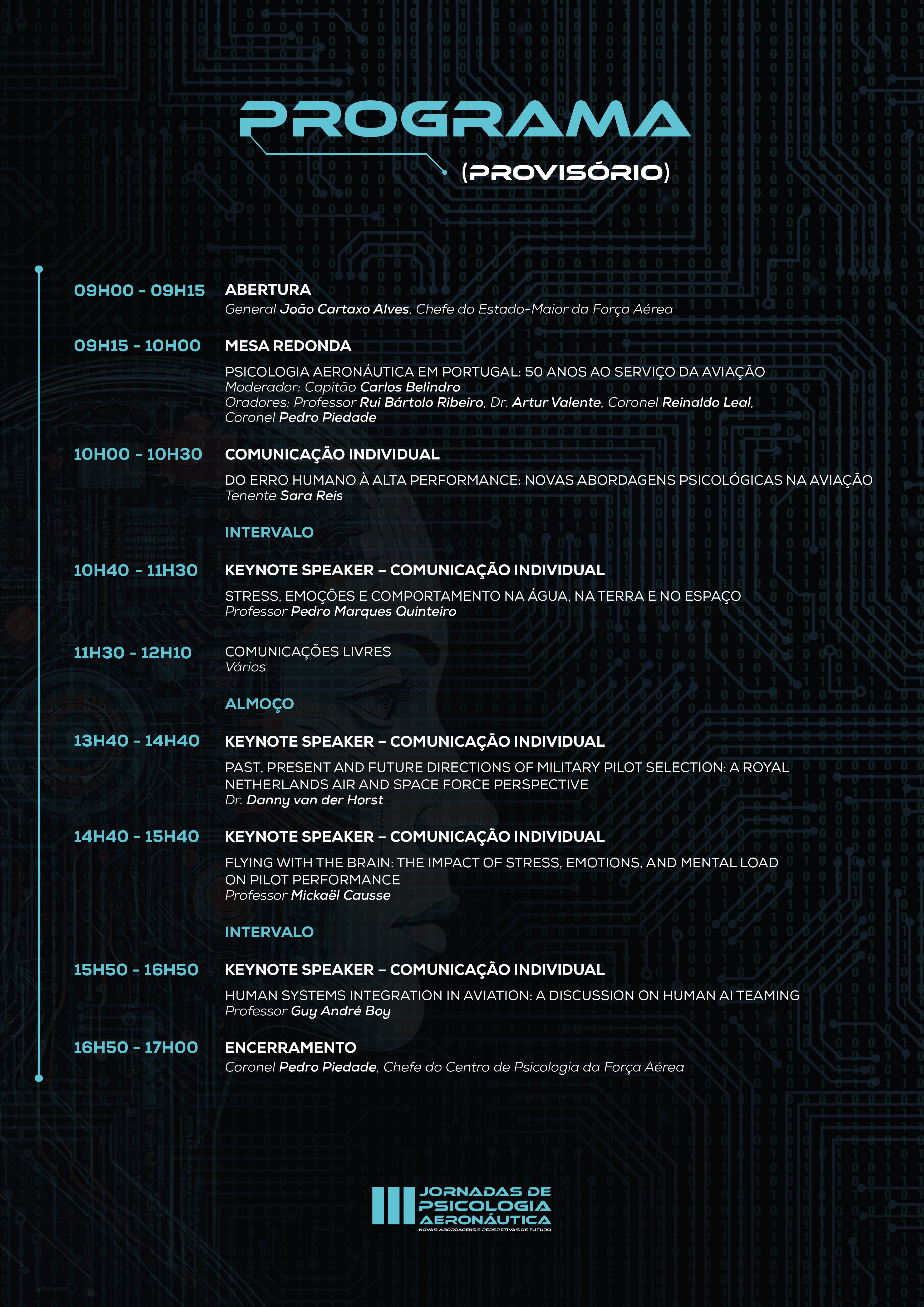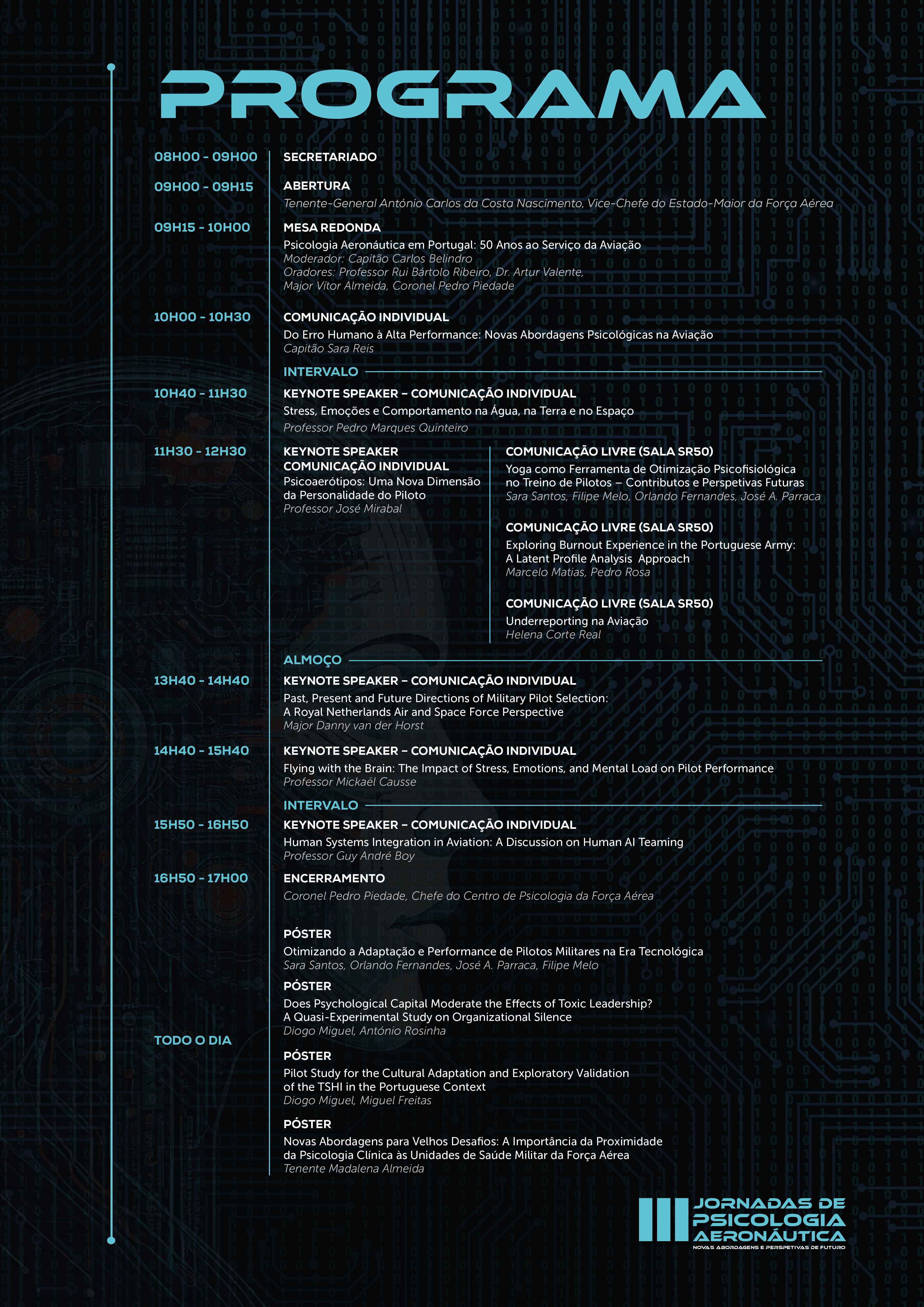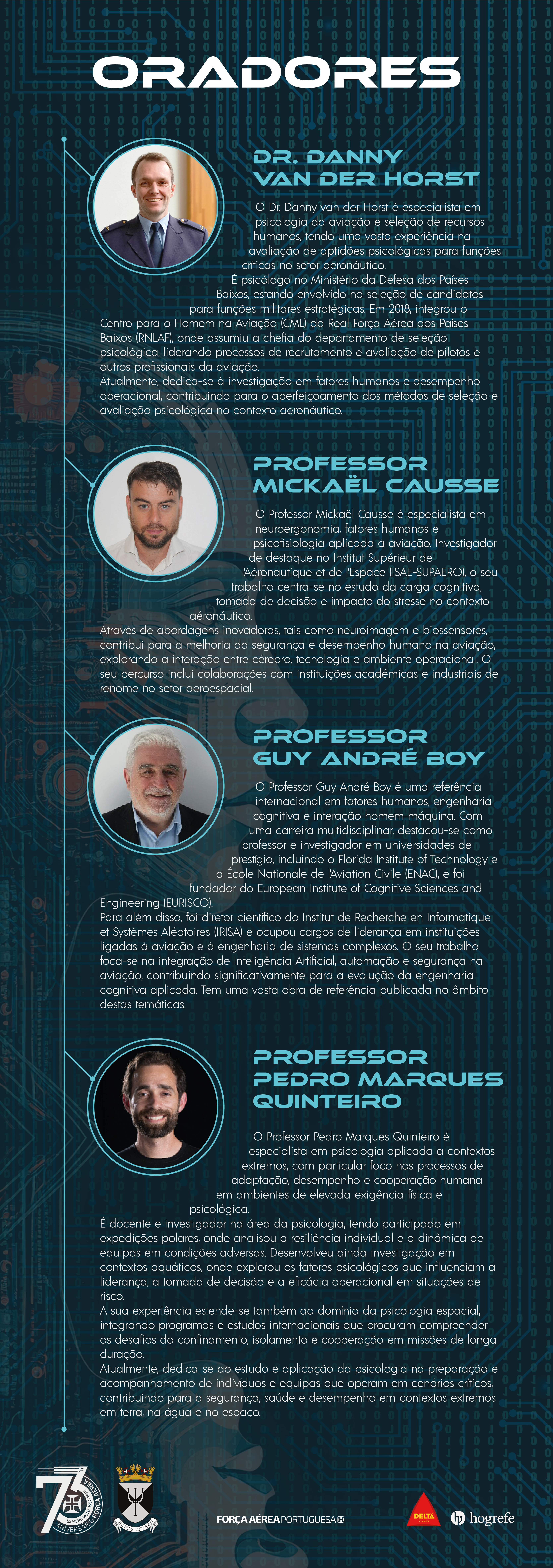 Através da contribuição de profissionais, investigadores, académicos e especialistas internacionais, pretende-se debater as implicações da tecnologia sobre a segurança operacional, a tomada de decisão, a carga cognitiva e a adaptação dos profissionais da aviação. A partir de uma abordagem interdisciplinar, serão abordadas novas metodologias para a avaliação psicológica, estratégias para a integração eficaz da Inteligência Artificial no ambiente aeronáutico e os desafios associados à confiança e colaboração entre humanos e os sistemas automatizados.